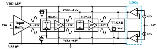 For this hybrid ADC, the compatibility of the blocks in different power supply voltages should be considered carefully. The high-linearity input buffer and the residue amplifier in MDACs usually require a higher power supply than the SAR quantizer [], resulting in a common-mode mismatch. To compensate for the mismatch, a negative supply was adopted for the integrated [] or external [] input buffer, which increases the design complexity for the standard CMOS technology []. And some low-power-supply residue amplifiers were proposed to adapt to SAR quantizer, as well as save power consumption in the previous studies, such as gm-R-based amplifier [] and ring amplifier [,]. However, they all suffer from some problems. The voltage gain of gm-R-based amplifier varies across process-voltage-temperature variation, resulting in the linearity deterioration of the ADC []. On the other hand, the ring amplifier is evolved from the ring oscillator which also may face the instability. Because the current of its last stage changes dramatically around the target settling point, resulting in a high nonlinearity for the large signal behavior of the ring amplifier []. In addition, the traditional calibration [] for the offset and gain mismatches can’t be directly used in the TI-SAR quantizer. Because it heavily relies on the statistical characteristics of the input signal which is changed by the non-idealities of the front MDACs [].