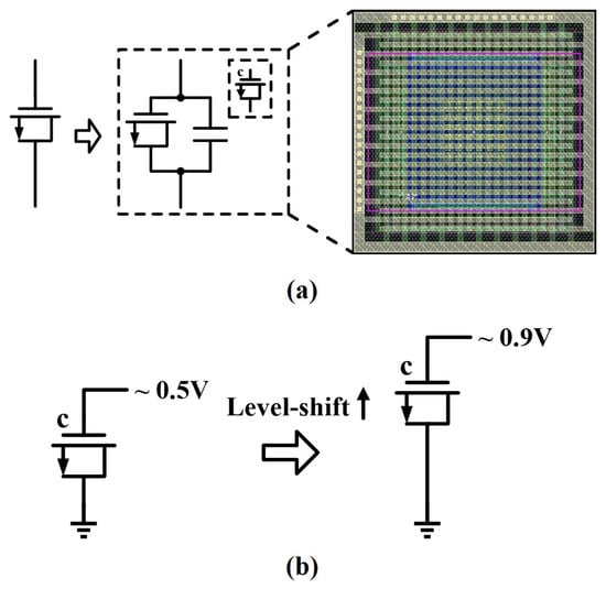 A hybrid structure for decoupling capacitor [] is adopted to increase the capacitance density for saving the die area cost as shown in Figure 9a. The MOS decoupling capacitor is the most area-efficient and most commonly implemented structure owing to the dielectric layer provided by the gate oxide layer []. Therefore the hybrid structure is based on the thick oxide MOS which can minimize the leakage across the gate oxide layer. A multilayer metal decoupling capacitor is placed on the top of the thick oxide MOS decoupling capacitor, and they are connected to each other electrically in parallel. Thus a higher capacitance is achieved with the same die area. The layout of the hybrid structure for decoupling capacitor is illustrated in Figure 9a. In addition, this hybrid structure can also be used for the calibration capacitor Ccal in Figure 7, where a large capacitance of Ccal would enhance the calibration accuracy. Unfortunately, the MOS capacitance is reduced when applied in the low-voltage supply. With the adaptive power/ground, the operating voltage of the MOS capacitor can also be level-shifted up, avoiding to work in the weak inversion. And a high capacitance density can be achieved for Ccal as shown in Figure 9b.