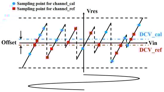 Nevertheless, when the calibration is applied for the TI-SAR quantizer in this hybrid ADC, the non-idealities of the MDACs would break the assumption above. Figure 11 illustrates the sampling points for the two interleaved channels (channel_cal and channel_ref) in the MDAC residue transfer curve with non-idealities. An asymmetry of the MDAC residue transfer curve is caused by the non-idealities, which changes the statistical characteristics of the two groups of sampling points, as well as results in an offset between their DCVs as shown in Figure 11. And it is similar to the MAVs.