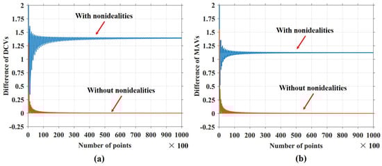 The differences of the DCVs and MAVs for the TI-SAR outputs are shown in Figure 12. For the ideal MDACs (without non-idealities), the differences of the DCVs and MAVs converge quickly to zero as the number of points collected increases, which fulfills the statistical requirements for the offset and gain calibration. However, when the non-idealities of the MDACs are taken into account (with non-idealities), a fixed offset are introduced between the DCVs for the TI-SAR outputs, and so do the MAVs. Thus, these offsets would be mistaken for the interchannel mismatches by the calibration algorithm in Figure 10, degrading the calibration performance.