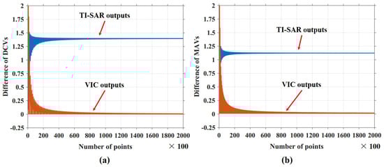 Differences of the (a) DCVs and (b) MAVs for the TI-SAR outputs, as well as the VIC outputs, taking the non-idealities of front MDACs into account.