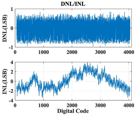 Measured differential nonlinearity (DNL) and integral nonlinearity (INL) of this hybrid ADC. There is no missing code.