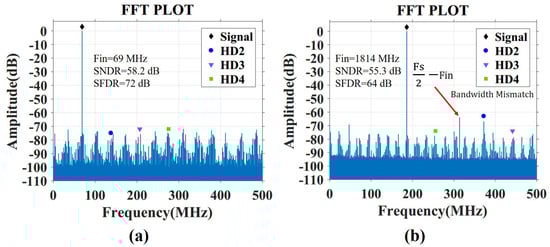Measured FFT spectrum at 1 GS/s for the input frequency of (a) 69 MHz and (b) 1814 MHz.