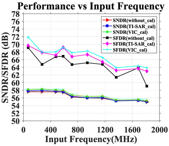 The offset and gain calibrations based on both TI-SAR outputs and VIC outputs are implemented. The SNDR and SFDR performance versus the input frequency is shown in Figure 18. Both calibrations can improve the SNDR and SFDR. Nevertheless, the calibration performance based on TI-SAR outputs is attenuated compared with that based on VIC outputs due to the statistical deviation of the TI-SAR input signal.