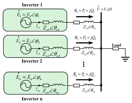 In order to analyze the network-based control, the equivalent circuit of micro-source paralleled to an AC bus is outlined as shown in Figure 2. To facilitate the analysis, distributed generation and its converter for each MG can be simplified as the ideal DC source, so that the circuit is equivalent to the system with three-phase inverters in parallel. As shown in Figure 2, the sum of output impedance and link impedance of the single inverter is . En, φn, and V are the amplitudes and power angle of the inverter output voltage and the common bus voltage, Sn, Pn, and Qn are the complex power, active power, and reactive power in output load provided by the nth inverter, respectively.
