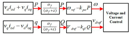 where ωref and Vdref are reference frequency and voltage amplitude of the nth inverter with no-load in d axle whereas reference voltage of q axle is zero. Pn and Qn are the active and reactive power, kpωm and kqVn are the droop coefficients. The modified reference values ωn and vdrefn are calculated and used as the references of the inner voltage loop for the nth inverter. The control diagram of power droop strategy is shown in Figure 6, where the output becomes the input of voltage and current control. Instantaneous power p and q are calculated by the output voltage and current variables vd, vq, iod, and ioq in dq0 coordinate. The filtered power P and Q are substituted into droop Equation (6) to generate the updated angular frequency ω and voltage amplitude vdref.