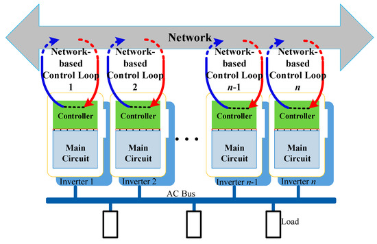 In primary control, there are at least two kinds of loops, the inner fast current/voltage loop and the outer slow power-droop loop. Sometimes, the power loop features an open loop unless virtual impedance or other strategy is added. In this paper, a novel idea related to the control loop is proposed, where the third control loop is designed to help the system in data-interaction via a network, in which the loop data flow is marked as a red arrow line and shown in Figure 1. As is well-known, the network transmission speed is adjustable and thereby the time-scale of the extra loop could be flexibly designed. That means it could be slower than or even comparative to the inner loop and power loop. Thereby, how to design the third loop and how to evaluate the impact of network-induced time-delays or data dropouts during transmission are very important.