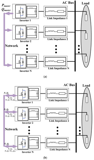 Schematic diagram of two modes in network-based control with inverter parallel operation. (a) Master-slave mode, (b) autonomous mode.