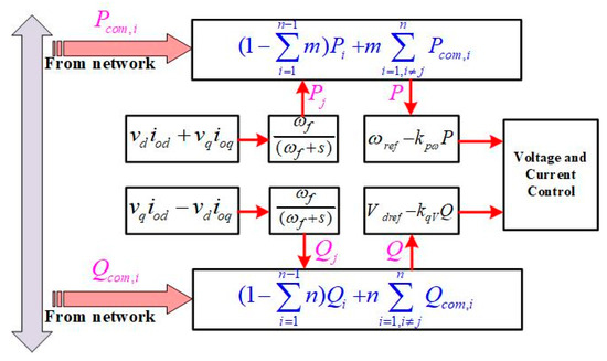 The network-based control can be expanded to the application with n paralleled inverters, the control block diagram is shown in Figure 9. Compared with traditional droop control as shown in Figure 6, the power information of each inverter is dispatched to the network and then broadcast to other inverters, which helps to modify the traditional power droop control. In Figure 9, the power Pj and Qj are obtained from real-time calculation, and the power control variables are generated by the combination functions with Pj/Qj and network data Pcom,i .