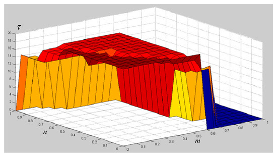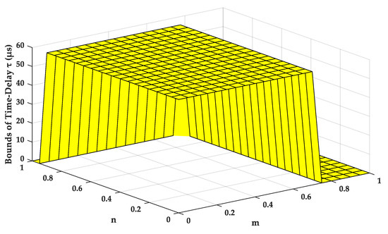 The situation of maximum time-delay less than h is still considered in this case. Considering h belongs to microseconds level, the bandwidth of the network will be bigger than the case with h = 20 ms. The relationship among control coefficients m/n and time-delay maximum bound τ values is presented in Figure 12. Through this three-dimension diagram, the selection scope of allowable time-delay to make system stable in most occasions is quite large, which shows a good robustness of time.