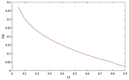 In order to gain a better understanding, is employed to represent the occurrence rate of data dropout. In this sense, indicates there is no data dropout, whereas all transmitted data is missing or in incorrect reception when . According to the above stability criterion, the bounds of maximum occurrence probabilities of data drop-out can be calculated, the results are shown in Figure 11. This is a two-dimension curve, plotted by on the horizontal axis and on the vertical. The waveform shows a nonlinear downward trend with the increasing of . If , the maximum occurrence rate of data dropout is approaching to 0.45. When , the value of gets very close to zero. In general, more accurate predictions can be achieved by seeking results of in the interval of (0.3, 0.7). Take the median of , the bound of maximum occurrence rate can be obtained by 0.118.