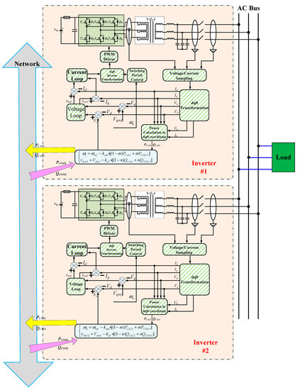 In order to enhance the expandability of network-based control, the rated power of each inverter should be considered, which means the load-sharing can be proportionally implemented based on their rated power. The network-based control strategy can be modified as follows based on control Equations (11)–(13):