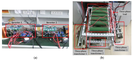 The experimental environment for the network-based control system with two paralleled three-phase inverters. (a) Two paralleled inverters. (b) Three-phase load and transformers.