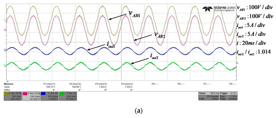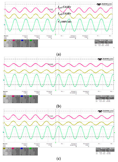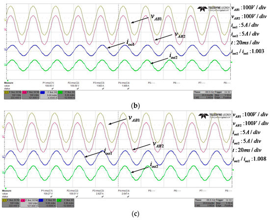 The steady-state output voltage and current in three different resistance loads when two inverters being paralleled are shown in Figure 15a–c. It is clearly shown that when the load changes, the A-B-phase output line voltage of the two inverters (vAB1, vAB2) basically remains unchanged, while the inductive currents (i.e., A-phase output current ioa1, ioa2) have the constant proportional variation. In addition, the difference value of these two output currents, i.e., circulating current is nearly zero, which means the load-sharing is quite satisfactory as expected.