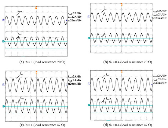 In this experimental test, θd is defined to quantify the data dropout. For convenience, it can be designed as constant packet loss ratio. For example, θd = 0.4 represents that 6 out of 10 data have been discarded or unsuccessfully transmitted. In actual operation, the deliberate design of θd is based on the transmitted ID of power data. For each 10 continuous data transmissions with contiguous IDs, we can artificially choose some of them out of the network-based control to fit the θd value. The comparisons of output current with inverter parallel operation between θd = 1 and θd = 0.4 in two load conditions can be observed in Figure 18. As described above, θd = 1 means there is no data dropout during the data transmission. From the results we can see power-sharing performance is barely affected by data dropout even if almost half of the transmission data is missing or blocked from being received. In addition, we tested worse network conditions such as θd = 0.3 and θd = 0.25, and the system kept stable and had satisfactory load-sharing performances as well. However, there will be a significant increase of load-sharing error when more data dropouts occur, especially when θd < 0.2, which is largely consistent with the theoretical analysis in Section 4.2. Overall, the network-based control shows a strong robustness towards data dropout.
