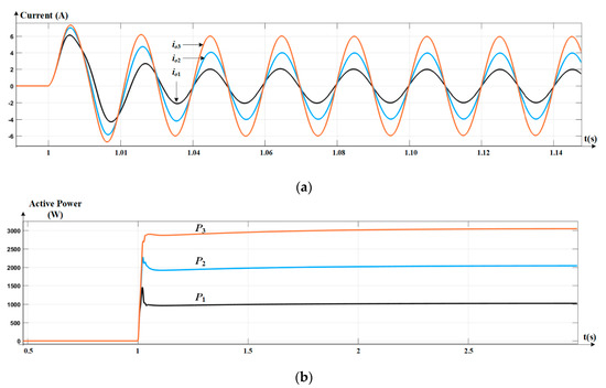 Output current and output active power of paralleled inverters when load is proportionally allocated based on their rated power (the ratio of ). (a) Output current io1, io2, and io3; (b) output active power P1, P2, and P3.