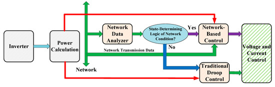 Another important issue, the abnormal situation or failure of communication should be considered. In this case, the adaptive data-processing method is proposed to prevent this kind of failure, as shown in Figure 22. Take one inverter as an analysis example, the “Network Data Analyzer” is used to detect the communication condition during the transmission. The “State-Determining Logic of Network Condition” part is used to judge whether or not the network is normal. If the answer is “Yes”, which means the communication is running in a good way, the network-based control continues. To the contrary, if “No” is obtained, the network-based control is aborted, and the control flow is switched into traditional power droop control. The green lines are addressed as network data and red one is its own power data via on-line calculation. Whatever the control direction the inverter follows, the derived control results have to be the input of voltage and current control. It is necessary to mention, the “Network Data Analyzer” is kept working continuously to diagnose the communication fault precisely. The event-triggered function is turned on when the results are finally definite.