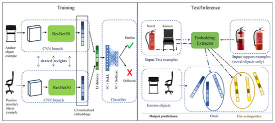 Object Recognition workflow. A Siamese Network comprising two ResNet50 CNN branches is trained on known object classes. The resulting 2048-dimensional feature embeddings are first L2-normalised and then combined through their component-wise L1 distance. The two fully-connected layers operate as a binary classifier to conclude on the similarity of each image pair. At test time, objects are classified based on the L2 nearest neighbour in the obtained feature space, comprising of: (i) the embeddings learned during training and (ii) the embeddings extracted for the input novel support examples.
