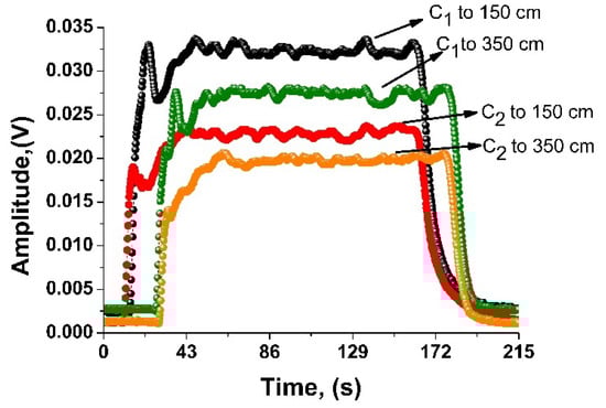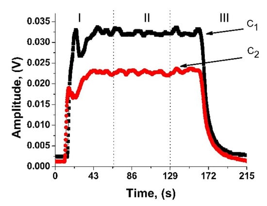 Figure 2 shows the temporal evolution of first coefficient C1 and second coefficient C2 of Fourier from the lock-in while the backscattered pulse cross through the mist; these coefficients correspond to fundamental frequency (ω) and second frequency (2ω) when the length of the chamber is of 150 cm. The curves show the switching from on to off from the UH in order to show the transition of the mist into the chamber. Description of the process can be divided in three parts. In the first part (I) starting from t = 0 s to t = 64 s, curves show the amplitude of the FC since the chamber is empty until it is filled with mist when the UH is turned on. The second part (II), from 64 s ≤ t ≤ 129 s the chamber is filled with mist and there is constant flow through all chamber; in the third part (III) corresponding to time t ≥ 129 s the curves show the free flow of the mist when the UH is turned off. The coefficients C1 and C2 have a time difference at the beginning of the filling of the chamber, this is due to the fact that the lock-in takes each of the coefficients in a commutated way, but in part II, the curves show that the time of commutated is irrelevant because the chamber is filled with mist and they show the turbulence of the mist inside of the chamber. Part II of Figure 2 is analyzed in order to validate the improvement of the LIDAR signal.