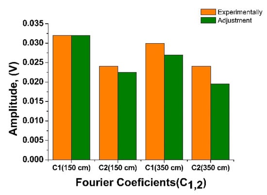 Experimental and theoretical Fourier coefficients for the chamber lengths of 150 and 350 cm are shown in Figure 5. The orange bar is the experimental average value and the green is the value obtained from the corresponding adjustment for two lengths of the chamber with mist. The Figure 5 shows that the theoretical estimate is adequate for the experimental results considering a Gaussian function. For the case of the mist contained in the chamber with a length of 350 cm, the theoretical FC moves away from the experimental value due to the fact that the temporal pulse is smaller in amplitude and noisier by the extinction of the pulse laser, but, the advantage of use the phase sensitive detection is the possibility of measure nosier signals [,].
