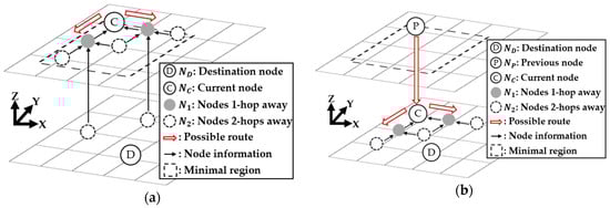 Transport-layer assisted routing (TLAR) balances the traffic load between layers, through separate routing in vertical and horizontal directions, based on topology information []. TLAR prefers downward routing and distributed traffic to achieve a thermal balance between layers with lateral routing through the selective use of deterministic and adaptive methods. However, when horizontal routable directions in the NSI mesh are insufficient, the TLAR performs mainly downward routing. Thus, the traffic load in the bottom layer rapidly increases, reducing the traffic load imbalance between layers.