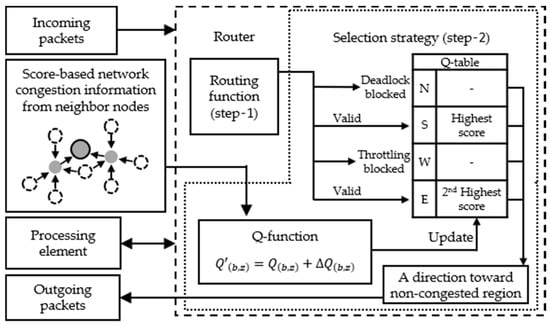 - Step 2. Q-function-based routable direction selection strategy—we check the buffer status of each node and score traffic information for each direction. Next, each node updates the Q-table after learning the state of network congestion and, based on the updated information, routes the packet to a non-congested direction among the candidate groups created in the preceding step.