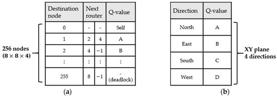 The second step of QTTAR is updating the Q-table based on network congestion information and selecting the direction with the most positive Q-value, as shown in Figure 6. The goal of this step is to select a final direction towards the non-congested region. QTTAR uses Q-learning to estimate the congestion of the network as close to the actual state as possible. Based on the estimated value, a Q-function-based routable direction selection strategy is established. Previous studies that introduced Q-tables in a 2D NoC [,,] stored estimates for the paths for all nodes in the system in each node. Figure 7a shows a conventional Q-table for a node in a 3D mesh network with an 8 × 8 × 4 topology. In the Q-table, each row corresponds to a destination. Because a separate row is dedicated to each destination in the network and the number of nodes increases in multiples of the number of layers (compared to a 2D NoC), the area overhead of the Q-tables becomes problematic in a 3D NoC. To minimize the size of the Q-table, we simplified the row index to four directions of the intra-layer rather than using the number of destination nodes, as depicted in Figure 7b. In an  3D mesh, the row size of the Q-table decreases  to four.