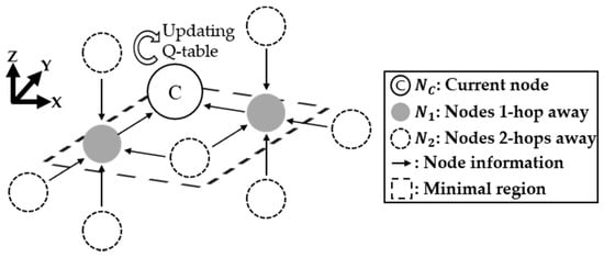 Updating the Q-value in the simplified Q-table is based on information from nodes that are two hops away, because the computational cost of searching all nodes is very high.  is one hop away from ,  is two hops away and these nodes belong to the minimal path region in the {North, South, East, West, Up, Down} directions of .  checks the throttling and buffer queue information of  and delivers an estimate to . The estimate is a medium for identifying the traffic congestion and throttling state for each direction in  a greater value indicates a more positive routing for that direction. Assuming an 8  8  4 topology, an estimate passed from  to  can reflect information from up to nine nodes, including one node up and one node down for the minimal region and two hops apart on the same plane, as shown in Figure 8.  can identify routing information by considering regional information, rather than network information limited to minimal regions.