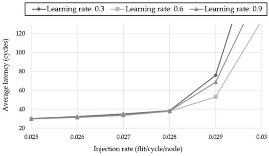 The parameter  is a learning rate for determining the weight of a delta estimate. The learning rate is a value between zero and one and determines how much to overwrite the old value by when reflecting new information to the Q-table. We can observe the best average latency when the learning rate is 0.6 (as determined through empirical experiments) and we used a learning rate of 0.6 in all experiments. Figure 9 shows the results from analyzing a learning rate of 0.6 compared to other values. A learning rate of 0.3 indicates that the old data have a heavy weight and 0.9 indicates that the new data have a heavy weight. Through this process, each node in the network updates the Q-table with the newly calculated , selects the direction with the largest value and then performs routing.
