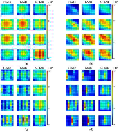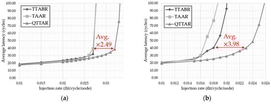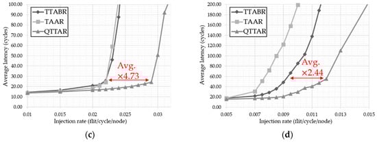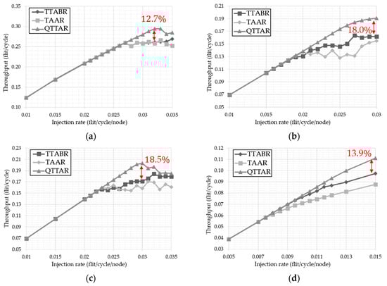 Figure 10 shows an average latency comparison for random, transpose-1, shuffle and bit-reversal traffic patterns for the same simulation time. The corresponding throughput comparison is shown in Figure 11. QTTAR showed performance improvement over TAAR and TTABR, regardless of the traffic pattern. Although TTABR provides greater path diversity than TAAR, the similar routing function produces almost identical latency. QTTAR achieved the highest latency improvement (3.98 times) in the transpose-1 traffic pattern, as shown in Figure 10b. Considering that the transpose-1 traffic pattern focuses on burst communication to a specific node, the result indicates that QTTAR effectively distributes packets that have the same destination. Thus, the proposed algorithm reflects the regional realistic congestion state in more detail through the Q-function, based on improved routing diversity and improved congestion-aware routing compared to other algorithms. Additionally, QTTAR exhibited a throughput improvement in the range of 14.0%–28.2% compared with TAAR and TTABR.
