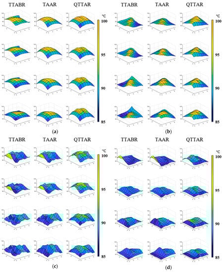 Traffic load and temperature distribution comparison under different conditions for thermal-aware adaptive beltway routing (TTABR), topology-aware adaptive routing (TAAR) and QTTAR.
