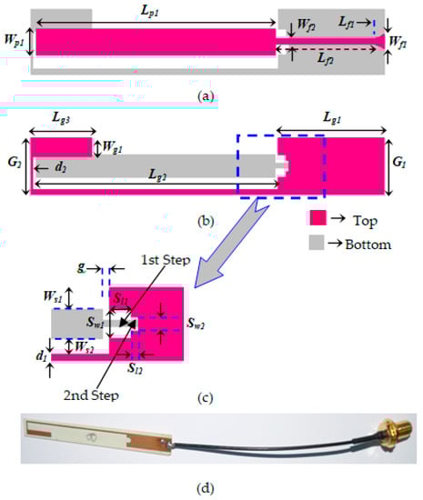 As presented in Figure 1b, the ground strip with length Lg1 + Lg2 + d2 is etched on the other side of the substrate and is shorted at the feed point. The widths of the two ends of the ground strip are G1 and G2. At the middle of the ground strip, there is an open slot of size (G2 − Wg1) × Lg2. To attain better coupling between the driven strip and ground strip, the lower portion of the open slot of the ground strip is steeped, as shown in Figure 1c. The dimensions of the first step and second step are, respectively, S11 × Sw1 and S12 × Sw2. The detail dimensions of the driven strip and the ground strip, as well as the presented antenna, are summarized in Table 1.