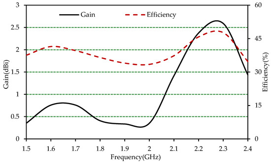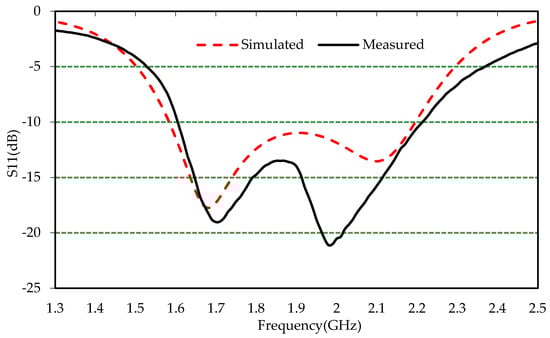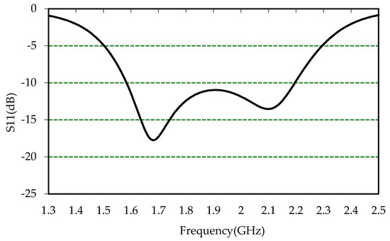 To understand the design consideration and working principle, the simulated S11 is depicted in Figure 2, where we can observe that the designed antenna exhibits a dual-resonant mode. As the I-shaped driven strip is used as radiator, it creates a 0.25-λ resonant mode at around 1.67 GHz, which is the fundamental mode. The resonance frequency for this mode can be calculated using the equation