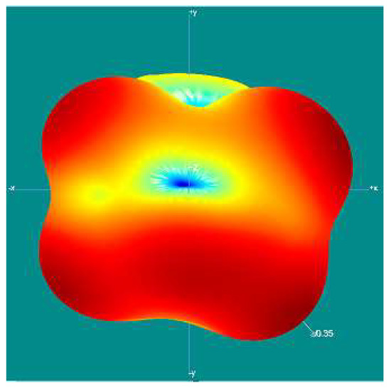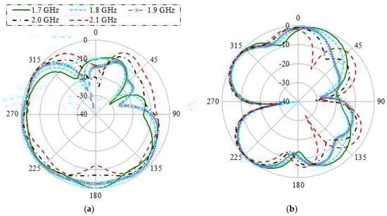 The radiation characteristics of the proposed antenna are measured using Satimo’s StarLab near-field antenna measurement system. The measured gain and efficiency of the prototype is presented in Figure 5, where it is revealed that, in the achieved operating band, the gain is about 0.76 to 2.45 dBi and the efficiency varies from 34% to 48%, which fulfils the requisite characteristics of many practical applications. The measured 2D radiation characteristic of the prototype is displayed in Figure 6. It is observed from the figure that the pattern in the E-plane is almost omnidirectional. In the H-plane, the patterns are almost dipole-like with the introduction of nulls, especially at higher frequencies. Despite the nulls in the H-plane, it can be revealed from the plot that the presented design exhibits the characteristics of stable radiation throughout the operating band, which is a prime requisite for mobile communication applications. As the designed antenna exhibits symmetric radiation characteristics over the entire operating band, it can be treated as a wideband antenna that has the capability to transfer data at a higher rate. Figure 7 displays the measured three-dimensional radiation patterns at 1.70 GHz, which show dipole-like omnidirectional radiation.