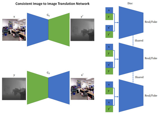 The proposed consistent image-to-image translation network consists of two cross-domain generators and a discriminator. The first cross-domain generator takes the 2D input images x from domain x with a resolution of , and it translates them to their corresponding cross-domain representations as with the same resolution as that of the input images. In contrast, the second cross-domain generator translates the 2D input images y from domain y to their corresponding 2D images of domain as . We follow the architecture of cGAN [10], where both the cross-domain generators, and , have the same configuration.