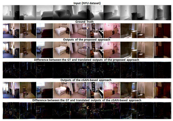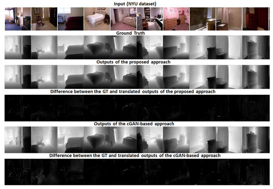 In the second experiment, we performed a comparative qualitative analysis for translating images from domain y to domain x using the NYU dataset [30]. First, we translated images from domain y to domain x and then evaluated the translated results based on the norm between the ground truth and translated images. Figure 4 summarizes the overall comparative results based on the NYU dataset. The first row shows the input domain y images; the second shows the ground truth images; and the third shows the images translated by the proposed approach. The error between the ground truth and the generated images is shown in the fourth row of Figure 4. The fifth row shows the images generated by the cGAN-based approach, and the last shows the error between the ground truth and the images generated by the cGAN-based approach. We followed the same procedure discussed in the previous section to evaluate the effectiveness of the proposed approach and the cGAN-based approach for translating images to the corresponding cross-domain. We observed that the proposed approach outperformed the cGAN-based approach in translating images from domain y to domain x.