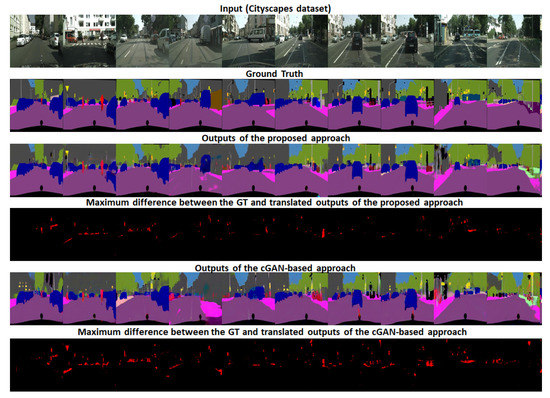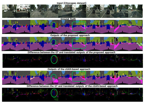 The lower the norm was, the more accurate and realistic the image translation was. Here, the norm was the pixel-wise difference between the ground truth images and the generated images from the proposed approach and the cGAN-based approach. We calculated the norm to show the effectiveness of the proposed approach in terms of per-pixel loss. From the fourth row, it can be seen that the difference between the translated images and their corresponding ground truth images was small compared with the cGAN-based approach in the last row. The shade of the objects is more prominent in the last row compared with the fourth row (the proposed approach) because of the high per-pixel loss. This showed that the proposed approach had more realistic translation compared with the cGAN-based approach. When directly comparing the outputs of the proposed approach and cGAN-based approach (the third and fifth rows), it was difficult to see the difference between them. However, the norm highlighted the error regions, thus providing a meaningful way for analyzing the performance of the proposed approach. In the second analysis, we used the Cityscapes dataset and followed the same procedure to evaluate the effectiveness of the proposed approach. The overall analysis is shown in Figure 3. The input images are shown in the first row, which were translated by the proposed approach and the cGAN-based approach, shown in the third and fifth rows, respectively. The distance between the outputs and their corresponding ground truth images is shown in the fourth and last rows, respectively. From the translated images, we can observe that the fine details in the images generated by the cGAN-based approach were not well represented, compared with the proposed approach. In Figure 3, the electric poles in the green box were not well translated by the cGAN-based approach, whereas the output of the proposed approach in the third row was closer to the ground truth image in the second row. Furthermore, the “van,” which is indicated by the green circle in the second row, was missing in the image translated by the cGAN-based approach, as shown in the sixth row; it was well translated by the proposed approach, shown in the third row. Moreover, the green ovals in the fourth and last rows represent the high-error regions, where the error was more prominent in the output of the cGAN-based approach compared with the proposed approach. This clearly showed the advantage of the proposed approach over the cGAN-based approach.