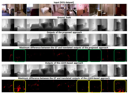 Figure 2, Figure 3 and Figure 4 compare the proposed approach with the cGAN-based approach. However, to further elaborate the comparative analysis, we highlighted the high-error regions. For this, we used a threshold value for the error output and marked the high-error regions in red, as shown in the fourth and last rows of Figure 5 and Figure 6. Figure 5 shows the comparative analysis of the NYU dataset and Figure 6 of the Cityscapes dataset. After applying the threshold to the erroneous output, we analyzed the results. The proposed approach had fewer erroneous regions than the cGAN-based approach for both the NYU and Cityscapes datasets. For example, the high-error regions in Figure 5 inside the green boxes from the proposed approach were almost negligible, compared with the high-error regions inside the yellow boxes from the cGAN-based approach. Furthermore, for the proposed approach, the error regions were mostly lying on the edges where the gradient was high. This was understandable because the nature of the convolution operation that learned the correlation in the pixels in the input space resulted in the smoothing of the boundaries of the high gradient regions. The output of the cGAN-based approach was affected by the boundary regions and also had erroneous regions in the low gradient regions.