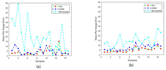 The qualitative results discussed above showed the effectiveness of the proposed approach for realistically translating images from one domain to their corresponding cross-domain, compared with the cGAN-based approach. However, for insight into the analysis of the proposed approach, we performed a quantitative analysis in this section. We used two different quantitative measures, the mean squared error (MSE) and SSIM, for the comparative analysis [10]. First, we randomly selected two batches of input test samples from the NYU [30] and Cityscapes [31] datasets and translated these samples to their corresponding cross-domains by using the proposed approach, the cGAN-based approach [10], and the BA-DualAE-based approach [28]. The sample-wise comparative analysis for the NYU and Cityscapes datasets in terms of the MSE is shown in Figure 7a,b, respectively. The green plot shows the error of the proposed approach, and the blue and cyan plots show those of the cGAN- and the BA-DualAE-based approaches, respectively. We could observe that 70% of the samples translated by the proposed approach from the NYU dataset had fewer errors than the cGAN-based approach, and more than 80% of the translated samples had fewer errors than the BA-DualAE-based approach. For the Cityscapes dataset, all samples generated by the proposed approach had a lower MSE than the cGAN- and the BA-DualAE-based approaches. Furthermore, the per-pixel and per-image MSEs between the ground truth and the generated samples from the proposed approach, the cGAN-based approach, and the BA-DualAE-based approach are listed in Table 1 and Table 2. Table 1 and Table 2 summarize the comparative analysis for the NYU dataset and the Cityscapes dataset, respectively. This quantitative analysis showed that the proposed approach outperformed the cGAN- and the BA-DualAE-based approaches by more than 26%. Furthermore, we also analyzed the structure of the images generated by the proposed approach, the cGAN-based approach, and the BA-DualAE-based approach; for this, we used SSIM. SSIM showed the structural similarity between the data generated by the network and the corresponding ground truth samples. The higher the SSIM was, the better the results were. The per-pixel and per-image SSIM results for the NYU and Cityscapes datasets are listed in Table 1 and Table 2, respectively. The per-pixel and per-image SSIM values were higher for the proposed approach than the cGAN- and the BA-DualAE-based approaches for both datasets, showing that the proposed approach outperformed the cGAN- and the BA-DualAE-based approaches.