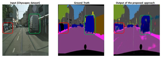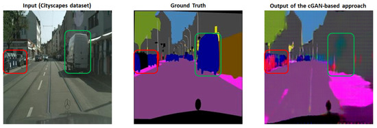 To further elaborate the stability and accuracy related to the existing cGAN-based approach in terms of imbalanced and inconsistent training, we considered an example given in Figure 8. The first image is the input to the image-to-image translation network; the second is the ground truth representation; and the last is the output of the cGAN-based approach. The training mechanism was imbalanced because the discriminator took the real and fake pairs in an imbalanced manner, resulting in unstable training. This made the discriminator converge faster than the generator. The fast learning of the discriminator inhibited the realistic output by the generator, which affected the accuracy. In Figure 8, the green boxes in the input and the corresponding ground-truth images show a “van.” The last image is the output of the cGAN-based approach where the “van” was not translated in the output image. Similarly, the red boxes in the input and the corresponding ground-truth images have different object labels, but the translated image from the cGAN-based approach showed the group of “people”.