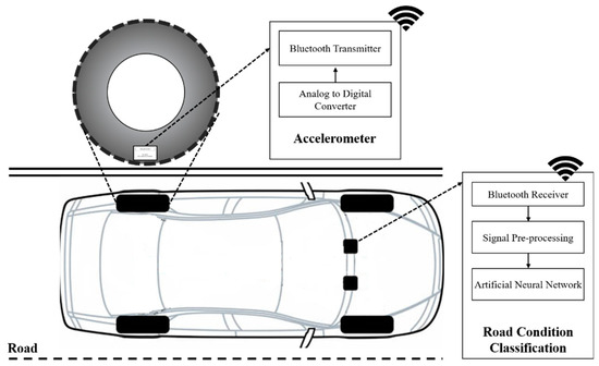 In general, iTires utilize the output of an acceleration sensor attached inside the tire to determine road conditions, which are relayed to the driver. The communication modality for iTires is usually wireless, because the sensor attached inside the rotating tire cannot be wired to the processing unit installed in the main body of the vehicle. Among the various wireless communication methods, Bluetooth is the most widely used because of its reliability and convenience. Figure 1 shows a schematic of the iTire system, including the accelerometer, the pathway for transmission of the acceleration data, and the road condition classification module that receives the data.