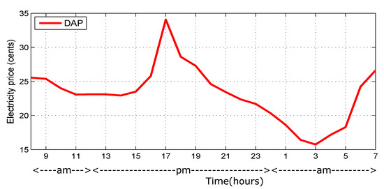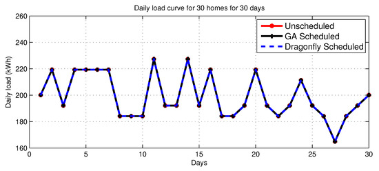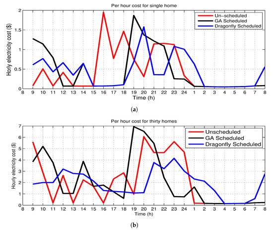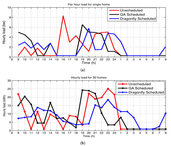 Figure 5 depicts the daily basis hourly load curve for a randomly selected single home and thirty homes for 24 h. According to the utility provided DAP signal, shown in Figure 2, peak hours range from 4:00 p.m. to 8:00 p.m., during which the energy prices are high. It is therefore clear from Figure 5a,b that both algorithms, i.e., GA and DA, have shifted the load from high price hrs to low price hrs. This shifting has drastically reduced the consumed energy cost. In comparison to GA, DA shows a bit of a uniform response.