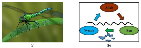 (a) Real dragonfly, (b) Life-cycle of dragonfly [8].