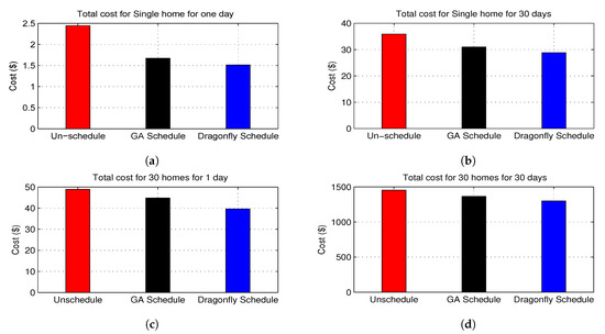 Figure 6 shows the hourly cost for a randomly selected single home and thirty homes for one day. It is clear from both Figure 6a,b that, in the un-scheduled case, prices are high. However, due to the shifting of the load from ON-peak hours to OFF-peak hrs, both GA and DA have reduced the cost for single as well as thirty homes.