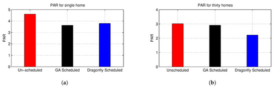Figure 9 depicts the PAR of single home and 30 homes. It is clear from Figure 9a that GA has reduced PAR to 22.94% for single homes and 03.30% for thirty homes, while DA has reduced it to 18.61% and 26.07% for single and thirty homes, respectively, as shown in Figure 9b. Thus, GA performance in terms of PAR reduction is better than DA; therefore, on the basis of simulation results, it is clear that, in a single home scenario, GA will be preferred, while DA will be preferred for multiple homes scenario.