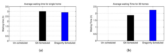 Figure 10 depicts the average waiting time of single and thirty homes. Figure 10a shows that, in terms of waiting time, DA gives better results for single home cases, while Figure 10b depicts that, for the thirty homes scenario, GA has less waiting time. It concludes that DA reduces cost but at the cost of consumer discomfort. Thus, those consumers who prefer to reduce their electricity bill instead of taking into consideration more waiting time may use DA and vice versa.