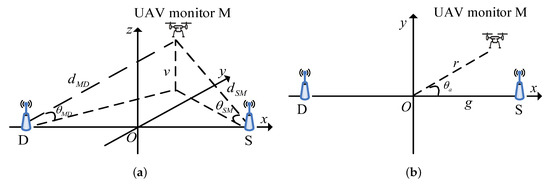 A UAV legitimate monitor operates in a full-duplex mode with simultaneous surveilling and jamming. Assume that the legitimate monitor has receiving antenna for surveilling and transmitting antenna for jamming, while the suspicious source and destination each have a single antenna. We adopt the three-dimensional Cartesian coordinate system, where S, D and M are located at at , , and , respectively, g is half of the suspicious link, r is the UAV radius ranging from 0 to , is the UAV azimuth angle ranging from 0 to 2 and v is the UAV altitude ranging from 0 to . As in reference [12,22], all channel state information (CSI) is available to UAV, while the suspicious link only knows its own CSI. In practice, we can locate illegal radio stations via received signal strength (RSS), angle of arrival (AOA), time of arrival (TOA), and time difference of arrival (TDOA), etc. If the location is not known, the jamming power and 3-D location optimization cannot be used for enhancing the surveilling performance.