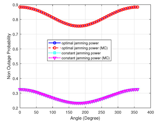 Hence, the surveilling non-outage probability optimization problem (P2) is transformed into problem (P3), and problem (P3) finds the optimal jamming power. When , problem (P3) is a monotone increasing function in and the maximum value of the function is obtained at . Otherwise, problem (P3) is a monotone decreasing function in and the maximum value of the function is obtained at 0. □