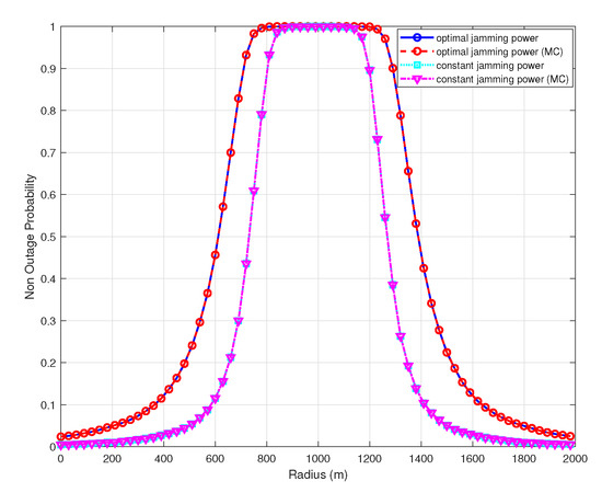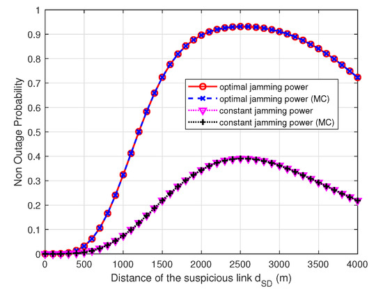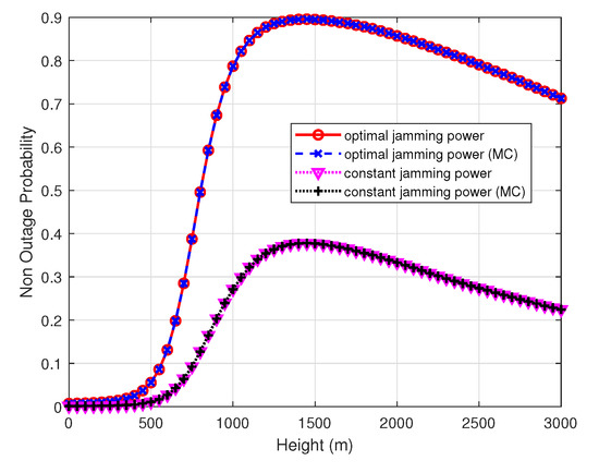 Figure 4 shows the UAV surveilling non-outage probability of the optimal and constant power allocation scheme versus the height of the UAV. The UAV non-outage probability increases with the height because the surveillance link can have better channel quality than the suspicious link and the jamming signal received at the receiver of suspicious link becomes large until UAV height is 1451 m, where the non-outage probability is the largest, and then with an increasing of the UAV height, the UAV non-outage probability decreases since the surveillance distance becomes larger, while channel quality remains unchanged and the jamming signal received at the receiver of suspicious link becomes smaller. The result shows that the reasonable control of the height can improve the surveilling performance of a UAV monitor that is consistent with our analysis. When the distance of the suspicious link is two kilometers, the theoretically optimal value is at the location (1000,0,1451). In this case, the monitoring performance is guaranteed, and the UAV is far away from the suspicious link to avoid being detected. The simulation parameters such as the distance between illegal nodes, the UAV height, etc., are set to be the same as or even smaller than other studies [18]. The 2 km is only a simulated distance, and the proposed method is applicable to cases with other distances.