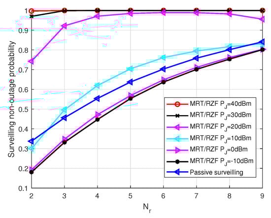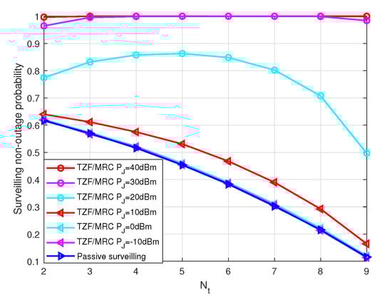 The surveilling non-outage probability of MRT/MRC scheme with different jamming power versus the number of transmitting antennas , , m, , , and .
